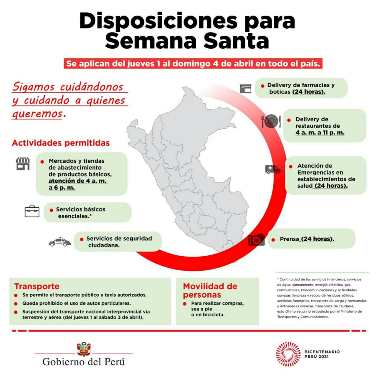 El funcionario detalló que se suspenderá el transporte interprovincial terrestre y aéreo el jueves 1 de abril, viernes 2 y sábado 3. Todas las tiendas de abastecimiento de productos básicos, supermercados, bodegas y farmacias pondrán atender de 4.00 a.m. a 6.00 p.m.