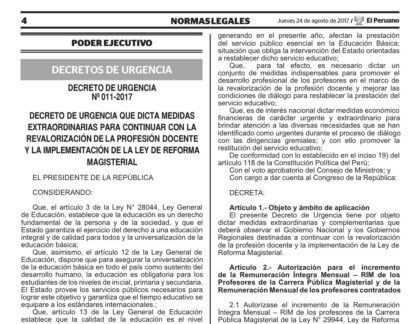 Entre ellos tenemos el adelanto para noviembre de 2017 del aumento a 2 mil soles del salario básico de todos los docentes contratados y nombrados con jornada laboral de 30 horas.