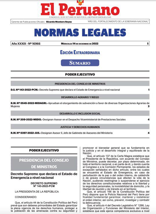 La tarde de este 14 de diciembre, el Gobierno oficializó el estado de emergencia a nivel nacional por 30 días. La medida fue publicada en el diario El Peruano. Hasta el momento, no se ha declarado toque de queda en territorio nacional.