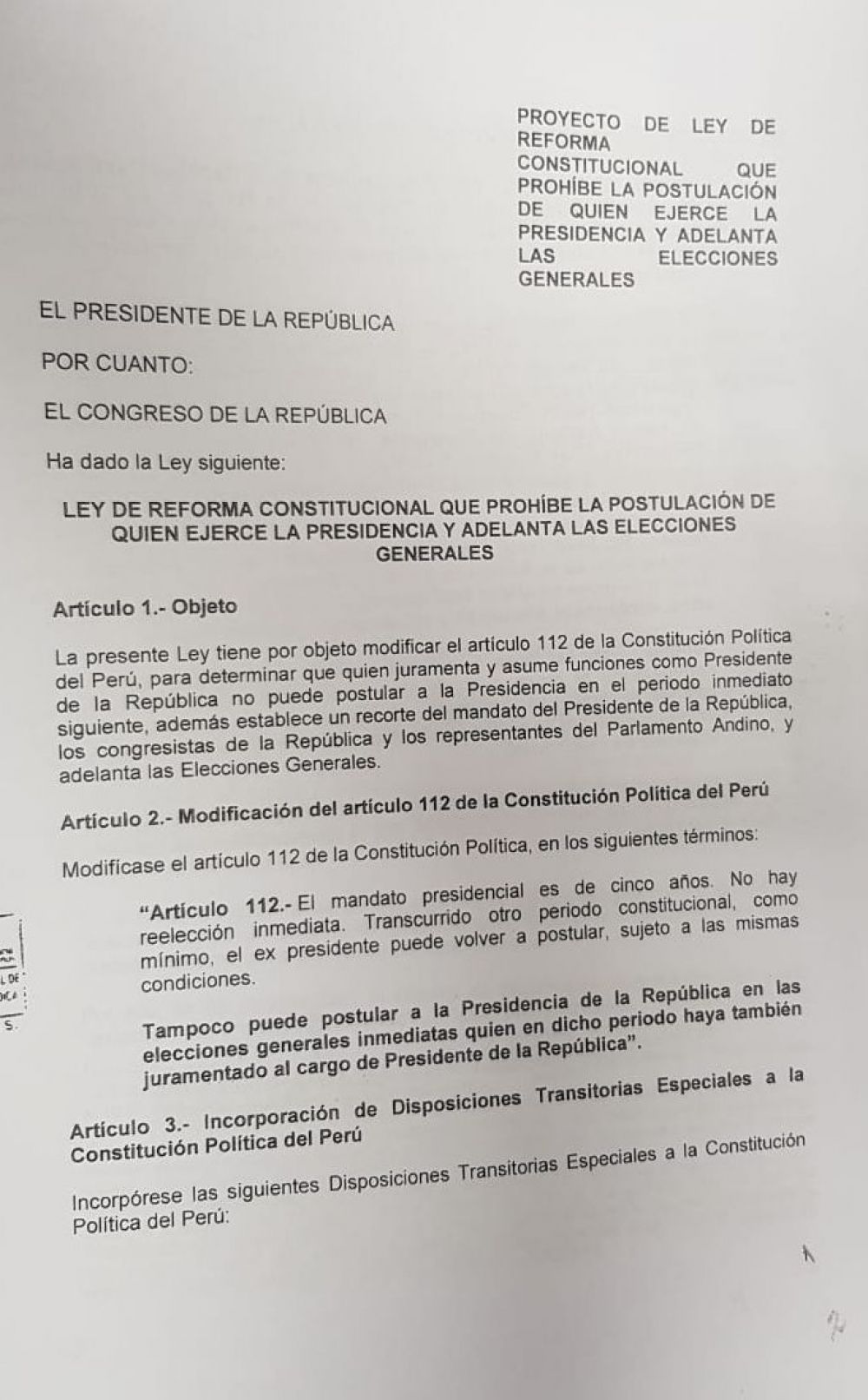 La iniciativa propone modificar el artículo 112 de la Constitución Política del Perú, «para determinar que quien juramenta y asume funciones como presidente de la República no puede postular a la presidencia en el periodo inmediato siguiente, además establece un recorte del mandato del presidente de la República, los congresistas de la República y los representantes del Parlamento Andino, y adelanta las elecciones generales».