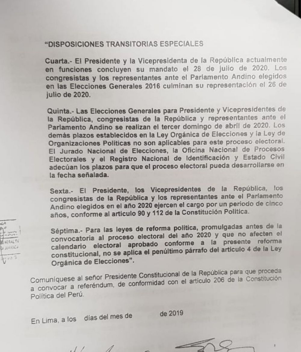 Según el proyecto, presentado con carácter de urgencia, la función del presidente de la República y de la vicepresidenta concluye el 28 de julio de 2020 y en el caso de los congresistas y parlamentarios andinos el 26 de julio de 2020.
