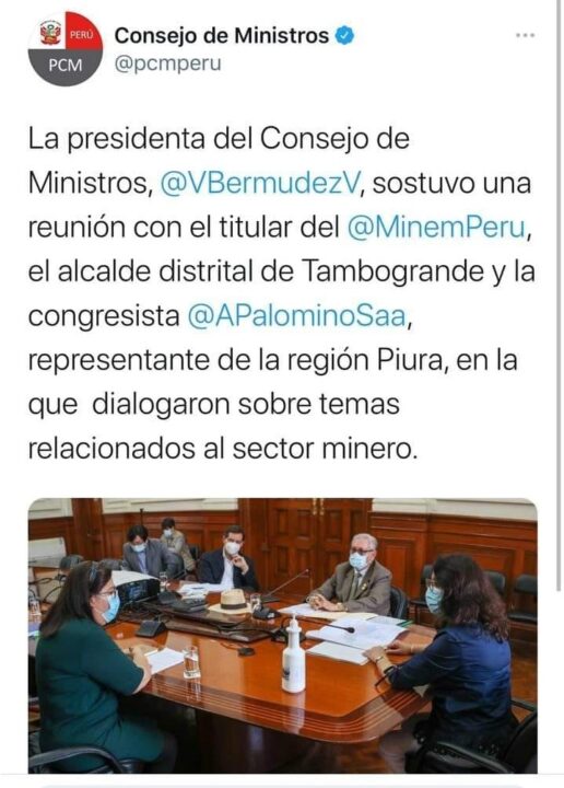 La primera ministra Violeta Bermúdez se reunió con el alcalde de Tambogrande, Alfredo Rengifo, quien le manifestó su rechazo a los decretos que autorizan a la minera canadiense Arco Iris, a operar en ese distrito.