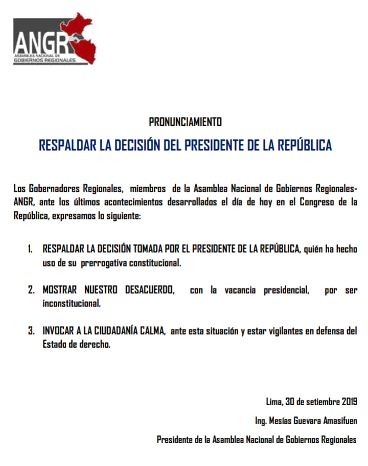 Los Gobernadores Regionales, miembros de la Asamblea Nacional de Gobiernos Regionales – ANGR, ante los últimos acontecimientos desarrollados el día de hoy en el Congreso de la República, expresamos lo siguiente:
