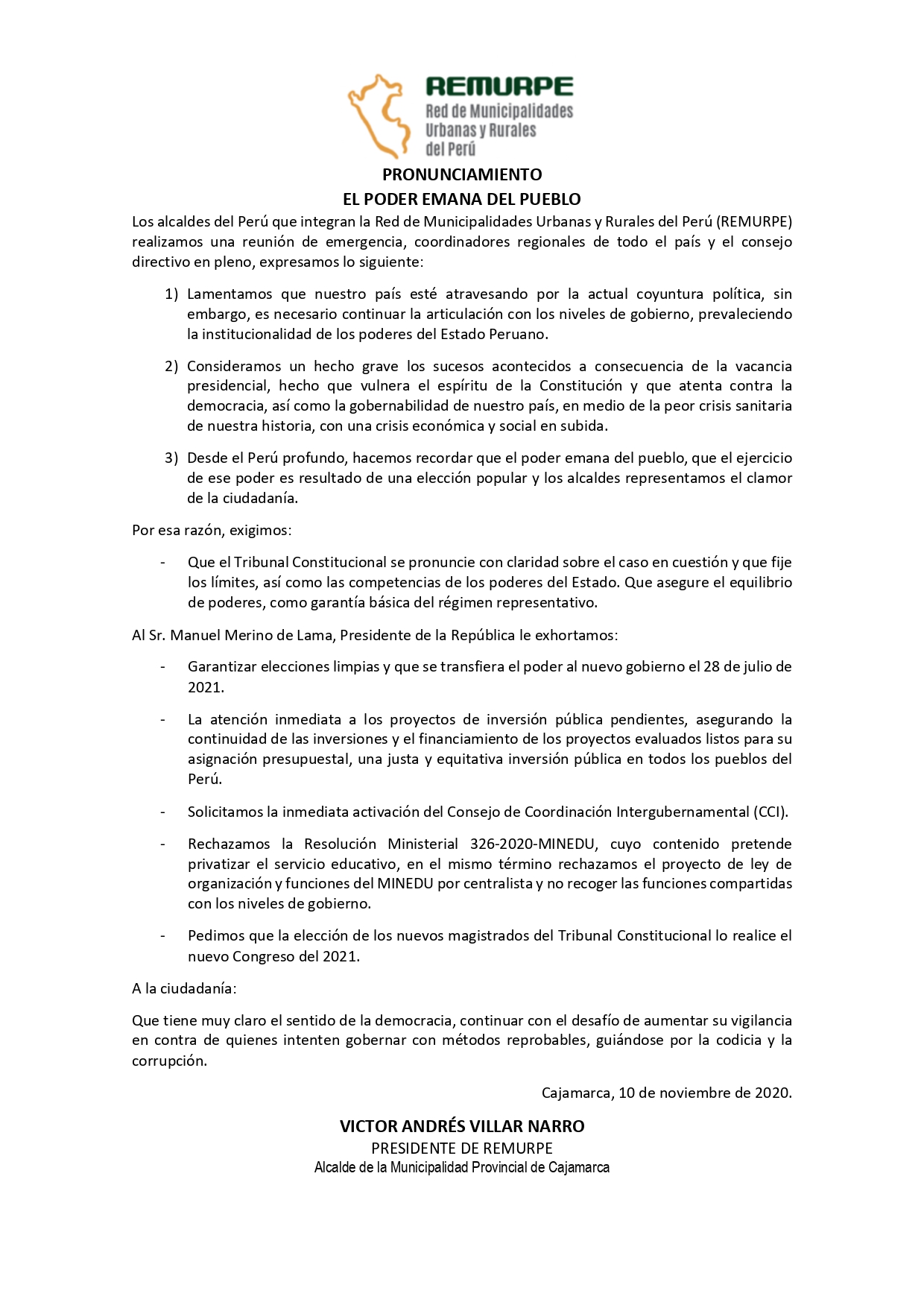 La Red de Municipalidades Urbanas y Rurales del Perú (REMURPE), presidida por el alcalde provincial de Cajamarca Víctor Villar Narro, y la Asamblea Nacional de Gobiernos Regionales (ANGR), presidida por el gobernador regional de Piura Servando García Correa, emitieron el martes 10 de noviembre, comunicados solicitando al presidente Manuel Merino de Lama la continuidad de las inversiones y del financiamiento de los principales servicios públicos.
