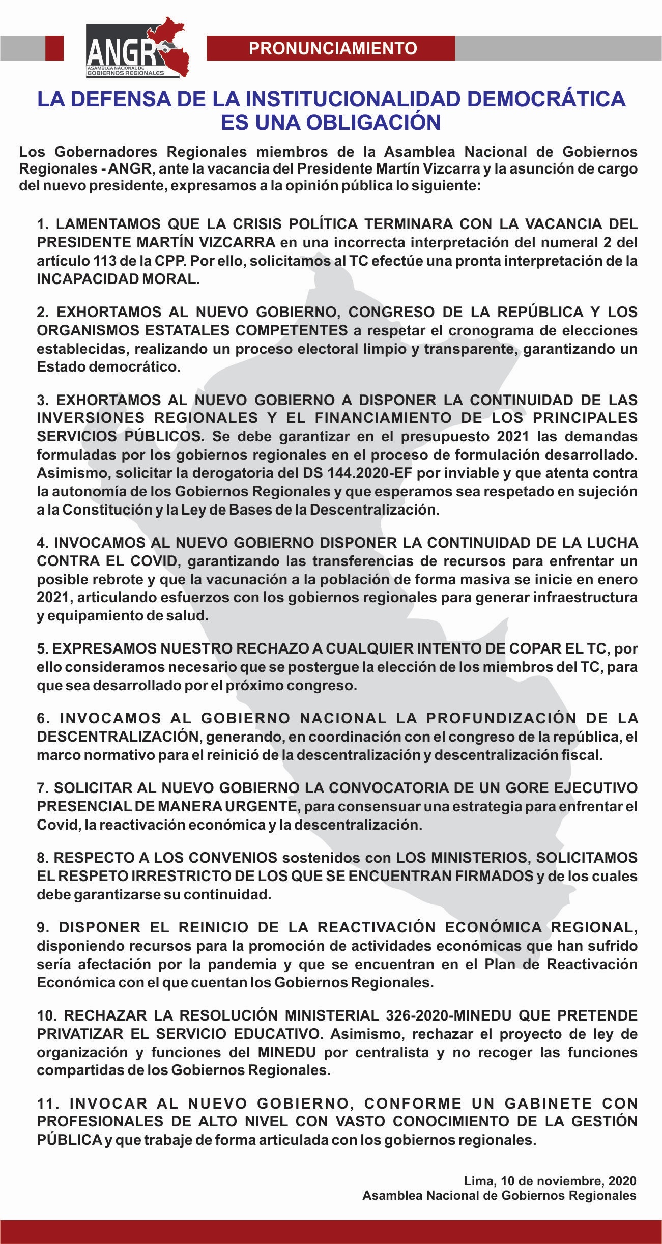 Las asociaciones expresaron su rechazo a la resolución ministerial 326-2020-MINEDU que, según indicaron, pretende “privatizar el servicio educativo”. En ese sentido, la ANGR solicitó al Gobierno formar un gabinete ministerial con profesionales de alto nivel, con conocimiento de la gestión pública, y que trabaje con las regiones.
