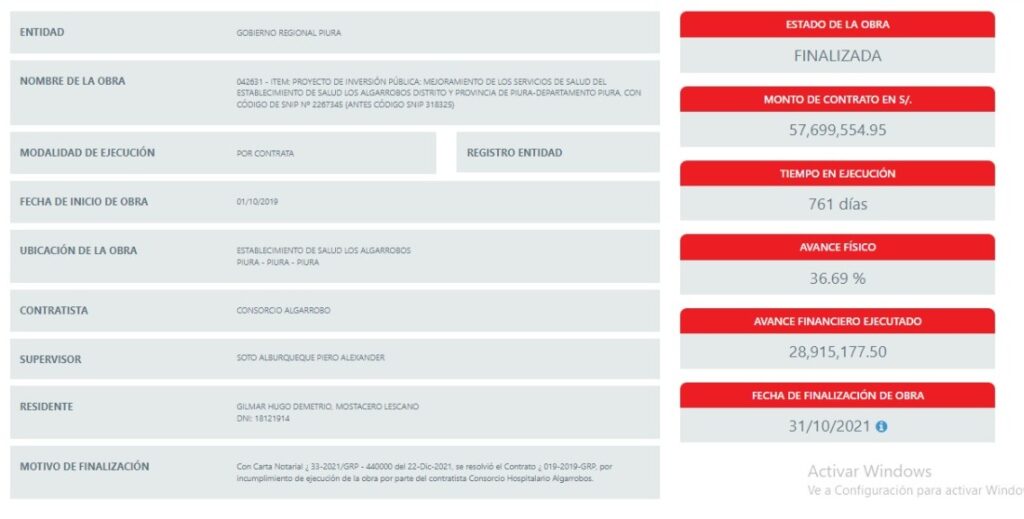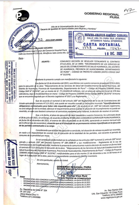 Cutivalú tuvo acceso a la carta notarial N° 032-2021 que el Gobierno Regional de Piura envió al representante legal del Consorcio Hospital Piura, Arturo Ernesto Delgado Vizcarra, en la que informa su decisión de resolver el contrato debido a que el establecimiento de salud de Huarmaca, provincia de Huancabamba, debió estar listo el 28 de julio de 2021, tras ser ampliado el plazo original debido al estado de emergencia por la pandemia. Sin embargo, “hasta el 06 de diciembre de 2021, el avance de la obra es de 43.34%, con un avance mensual de 0.12%”.