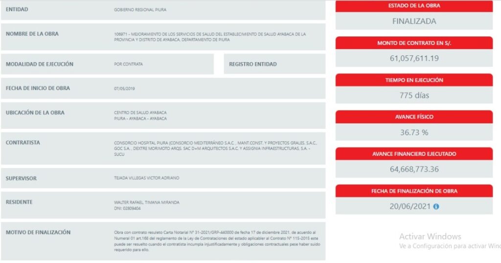 La construcción del establecimiento de salud en Ayabaca ha corrido con la misma suerte. El portal de Infobras revela que la obra valorizada en 82 millones 861 mil 919 soles, tiene un avance físico de 31.96%, pese a ello, ya se han cancelado 61 millones 604 mil 83 soles.