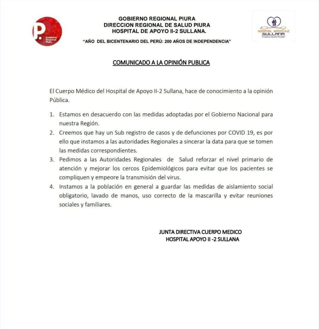 El Cuerpo Médico del Hospital de Apoyo II-2 de Sullana emitió un comunicado informando que está en desacuerdo con las medidas adoptadas por el Gobierno Nacional para la región Piura y que considera que hay un subregistro de casos y defunciones de covid-19. Según explicó la presidenta del Cuerpo médico del hospital de Sullana, Dra. Patricia Montoya Reyes, es muy probable que el Gobierno no tenga las cifras exactas de los pacientes positivos, pues, en Piura han disminuido las pruebas, hay demoras en el procesamiento de la data, ya no se hacen campañas de tamizaje en lugares públicos y tampoco se controla un cerco epidemiológico para contactos directos directos de los pacientes positivos, aumentando el riesgo de contagio.