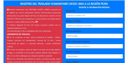 El gobierno regional habilitó la página web para los piuranos que se encuentran en Lima en situación de vulnerabilidad y desean regresar a la región. El enlace es www.regionpiura.gob.pe/retornos, donde se debe completar un formulario de datos para luego ser evaluados y aprobar el viaje. Los datos son: el número de DNI, apellidos y nombres, … Sigue leyendo Habilitan enlace virtual para que piuranos vulnerables en Lima regresen a la región