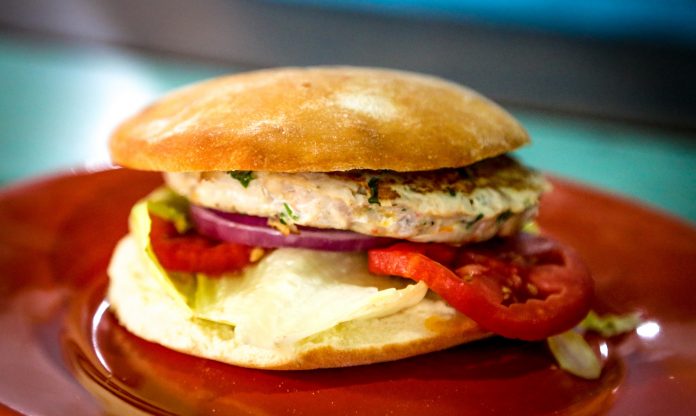 Abrir un pan, colocar una hoja de lechuga, dos rodajas de tomate y la hamburguesa.