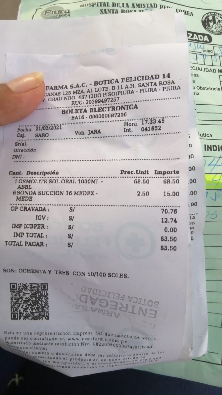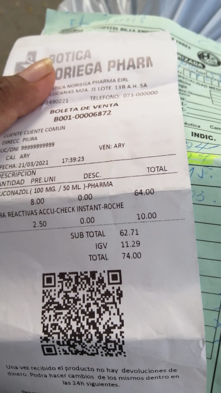 “Nos hicieron sacar dos pruebas antes de que la ingresen a hospitalización, nos costaron 160 soles, luego para que ingrese a UCI otros 170 soles nos cobró el laboratorio privado”, contó el familiar a través de Cutivalú.