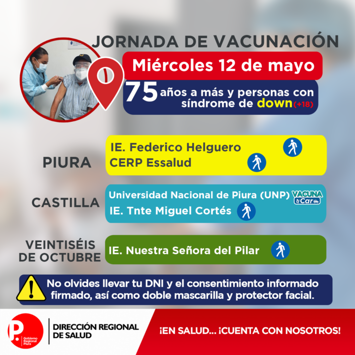 La Dirección regional de salud informa que hoy miércoles 12 de mayo continúa la vacunación en los distritos de Piura, Castilla y Veintiséis de octubre para adultos mayores de 75 años y personas con síndrome de Down que sean mayores de 18 años.