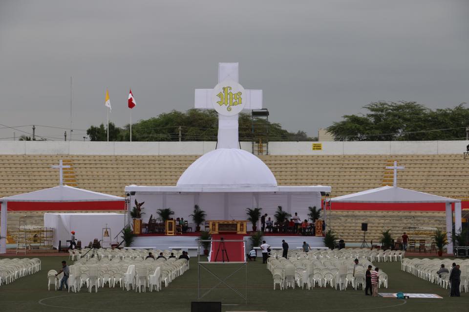 El imponente escenario ubicado en la zona sur del campo deportivo del Estadio Miguel Grau de Piura luce envuelto en impecables telas blancas que dan forma a la magnífica cúpula que corona la estructura, tras de la cual una imponente cruz se eleva hacia el cielo. Una gran rampa une la explanada con el escenario y permitirá el acceso de los cardenales, arzobispos, obispos y sacerdotes al Altar donde se celebrarán la Santa Misa cada uno de los días del Congreso.