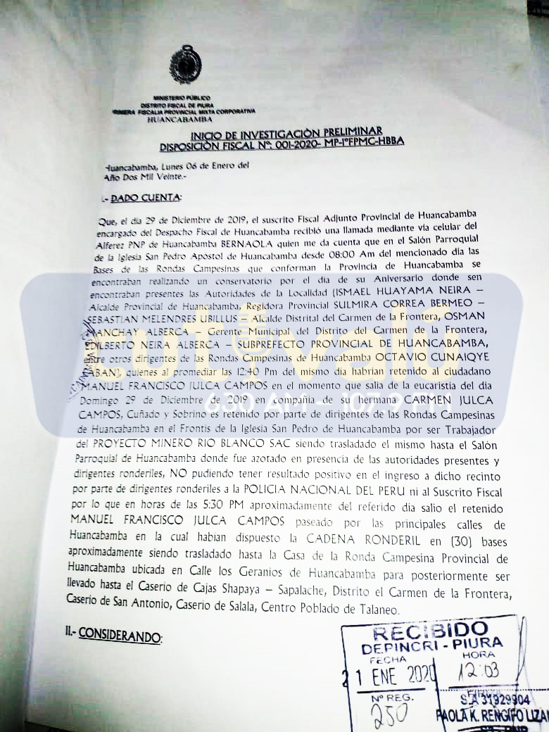 El fiscal de Huancabamba, Oscar Guerrero Rivera, abrió la investigación preliminar por los presuntos delitos de lesiones graves, secuestro y tortura en contra del expolicía, Manuel Julca Campos, agente de seguridad de la minera Río Blanco Cooper.