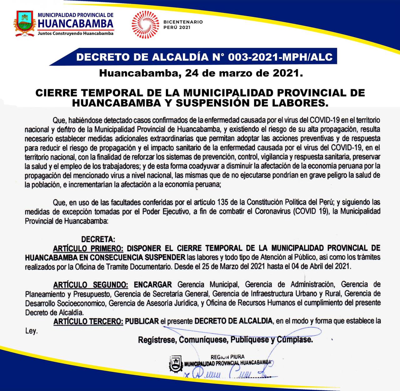 La Municipalidad Provincial de Huancabamba informó mediante un comunicado en sus redes sociales, que por motivo de haber encontrado casos de covid-19 en su personal, cerrará su establecimiento desde este jueves 25 de marzo hasta el domingo 04 de abril.