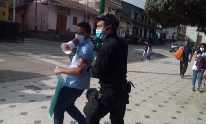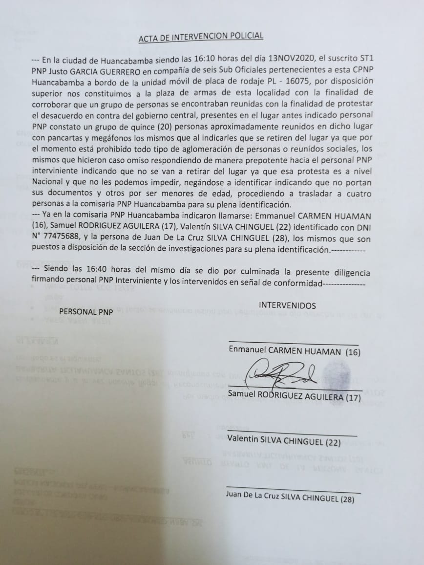 Cuatro jóvenes, dos de ellos menores de edad, fueron detenidos la tarde del viernes 13 de noviembre, cuando realizaban una marcha pacífica en la Plaza de Armas de Huancabamba. Se trata de Emmanuel Carmen Huamán, de 16 años; Samuel Rodríguez Aguilera, de 17; Valentín Silva Chinguel, de 22 y Juan Silva Chinguel, de 28.