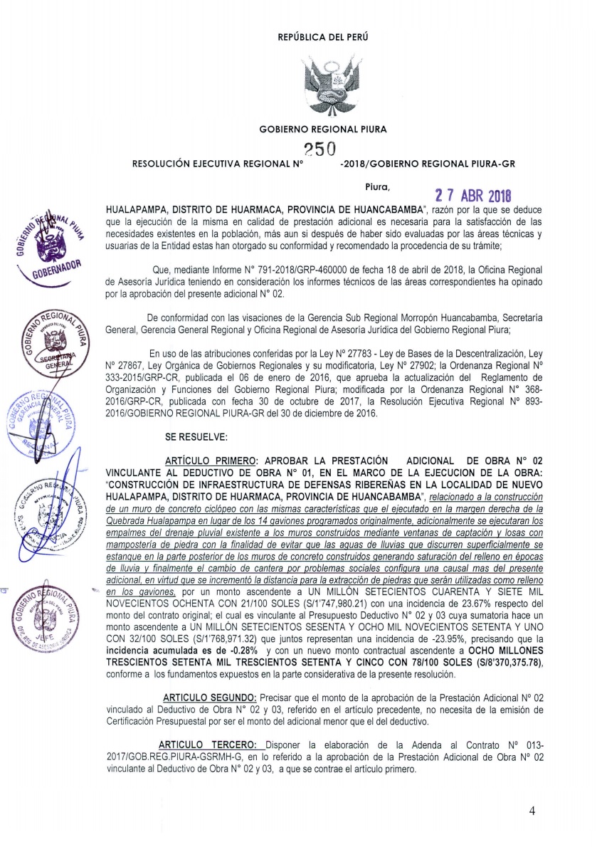 Según la Resolución Ejecutiva N° 250-2018, con fecha 27 de abril del 2018, el adicional corresponde al deductivo de obra N° 1, relacionado a la construcción de un muro de concreto ciclópeo con las mismas características que el ejecutado en la margen derecha de la quebrada Hualapampa.