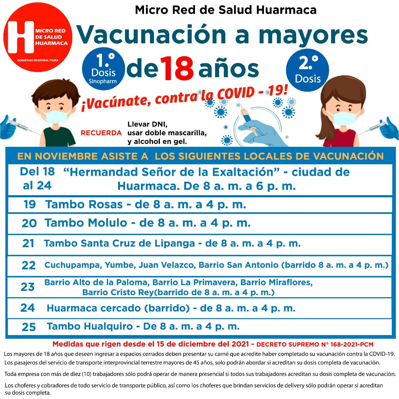 Cabe indicar que esta es la programación para la campaña de vacunación que realiza el centro de salud de Huarmaca en los próximos días para los mayores de 18 años de primera y segunda dosis: