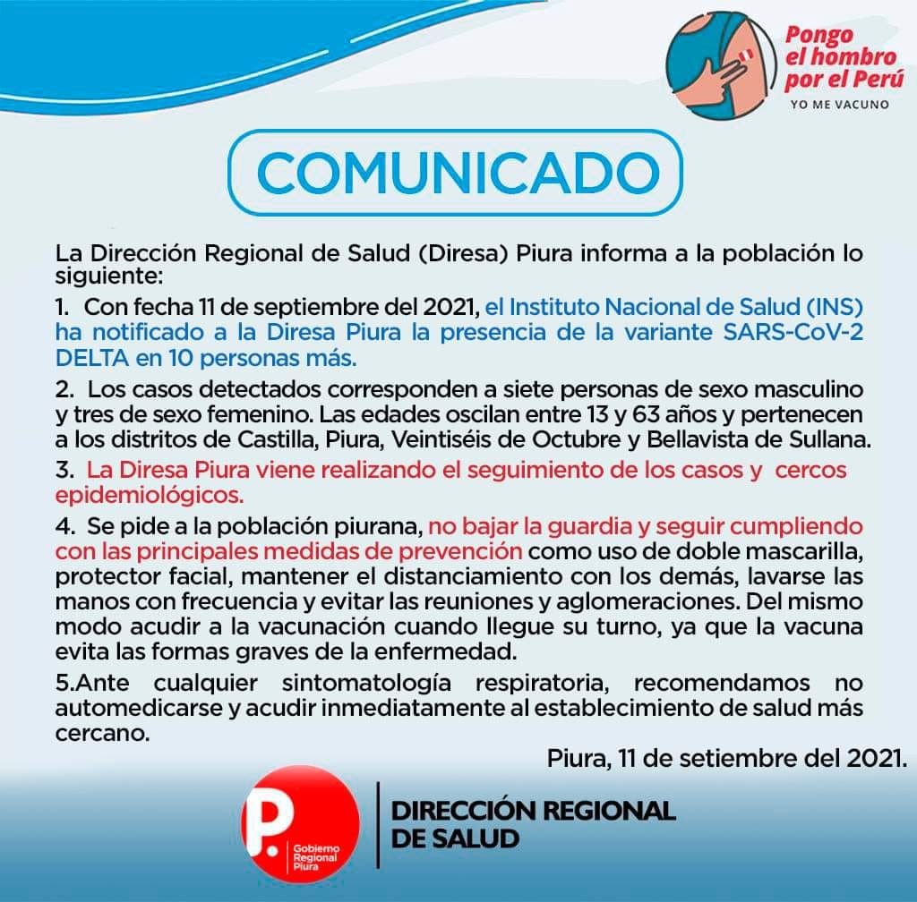 De acuerdo con el mensaje difundido por la institución, se identificó la variante en siete varones y tres mujeres, pertenecientes a los distritos de Castilla, Piura, Veintiséis de Octubre,y Bellavista, de la provincia de Sullana