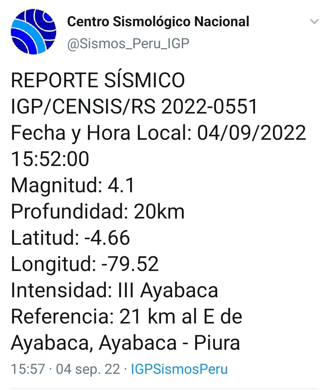Este domingo 04 de setiembre se registró un sismo en Ayabaca, a las 03:52 de la tarde, con una magnitud de 4.1 grados. El epicentro del sismo se localizó a 21 kilómetros al este de esta provincia y su profundidad fue de 20 kilómetros, según lo indica el Instituto Geofísico del Perú (IGP).