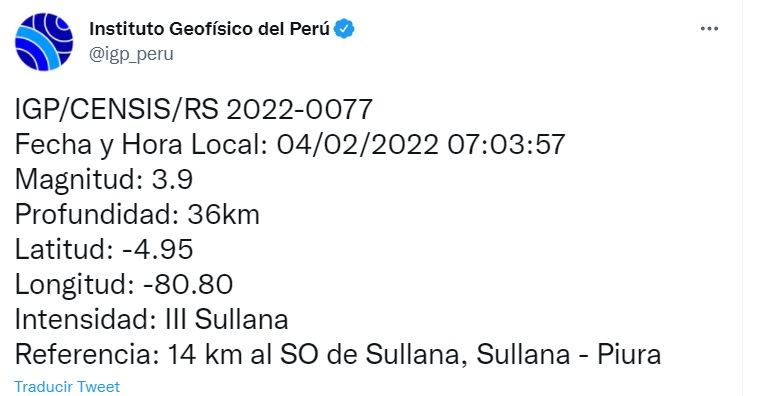 Este viernes 04 de febrero se registró un sismo en la provincia de Sullana, a las 07:03 de la mañana, con una magnitud de 3.9 grados. El epicentro del sismo se localizó a 14 kilómetros al suroeste de esta provincia y su profundidad fue de 36 kilómetros, según lo indica el Instituto Geofísico del Perú (IGP).