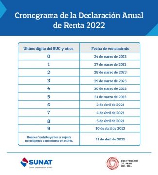 De acuerdo con el cronograma de vencimientos de la Sunat, la presentación se inicia el 24 de marzo y dura hasta el 11 de abril de este año, considerando el último número de RUC del contribuyente.