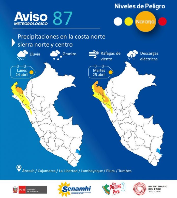 Las lluvias de moderada a fuerte intensidad no cesan en la costa norte y sierra norte-centro; y hay un nuevo pronóstico de extensión hasta mañana martes 25 de abril, informó el Servicio Nacional de Meteorología e Hidrología (Senamhi), que alertó a 42 provincia de 6 regiones.