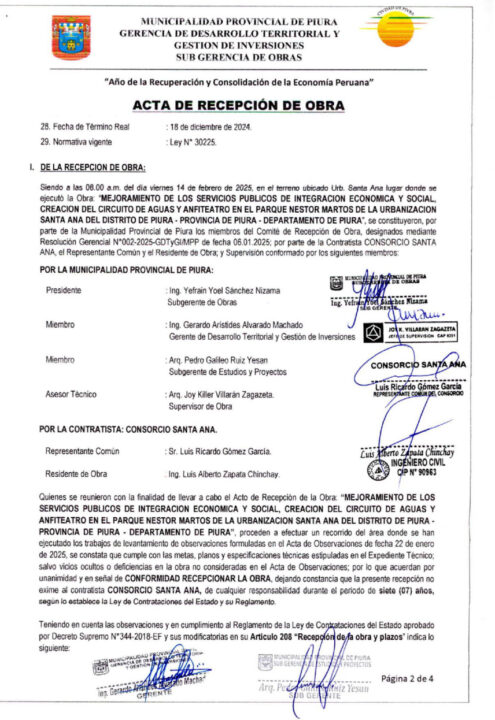De acuerdo al Acta de Recepción de Obra, del 14 de febrero del 2025, la Municipalidad de Piura detalla que la Contratista Santa Ana levantó las observaciones el 22 de enero. Asimismo, la comuna piurana refiere que el consorcio cumplió con las metas, planos y especificaciones técnicas estipuladas en el expediente técnico.