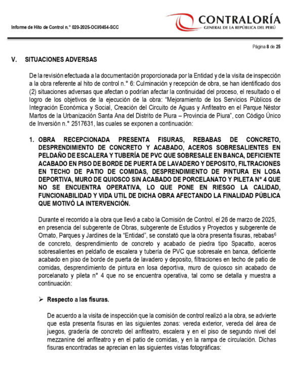 De acuerdo al Informe de Control Concurrente N° 020-2025, desarrollado por la Contraloría General de la República, esta obra presenta serias deficiencias y situaciones adversas. Esto pone sobre la mesa el trabajo que hizo el ente supervisor de la obra y el comité de recepción de este cuestionado parque.