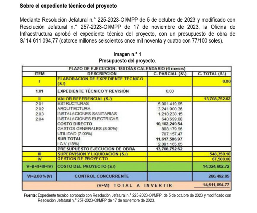 El presupuesto para la construcción de esta innecesaria obra fue de 14.6 millones de soles, según la Resolución Jefatural N° 257, del 17 de noviembre del 2023. Dentro de este rubro de gastos, sólo las estructuras contemplaron un presupuesto de 5 millones de soles. En el caso de la arquitectura del lugar, se utilizó 3 millones de soles del presupuesto general. Aún con todo este millonario gasto en ítems específicos, esta obra muestra un estado de deterioro y ausencia de material.