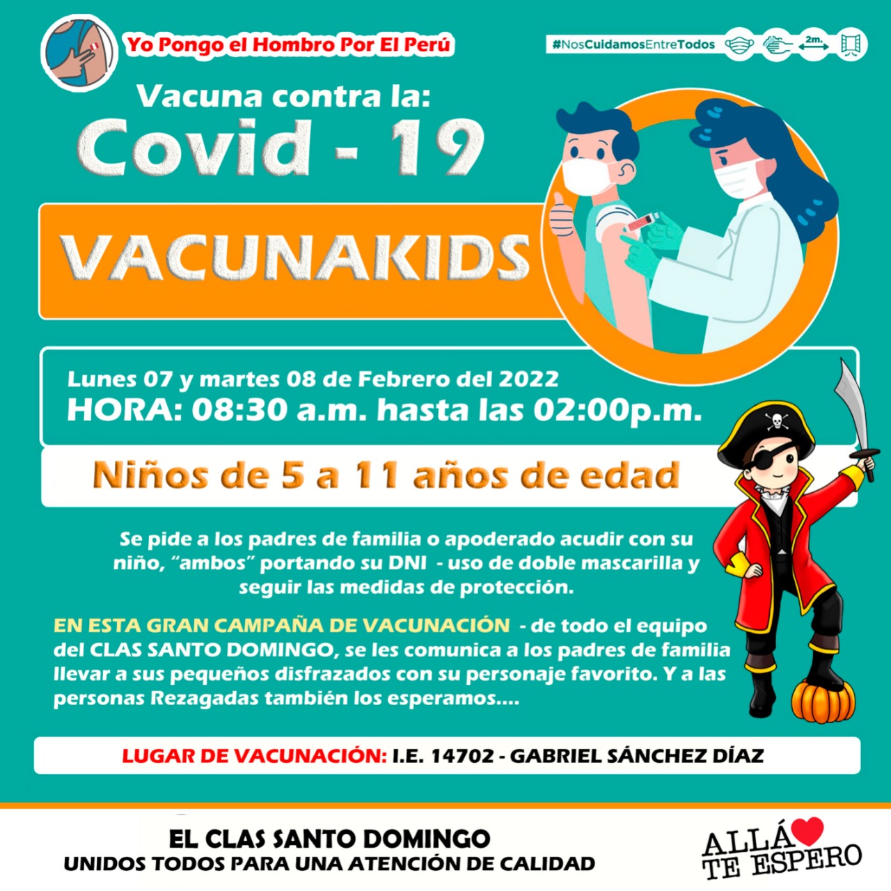 Según el anuncio de CLAS Santo Domingo, el punto de inmunización será la I.E 14702 – Gabriel Sánchez Díaz. La jornada de vacunación será durante los días 07 y 08 de febrero de 8:30 am a 2:00 pm.