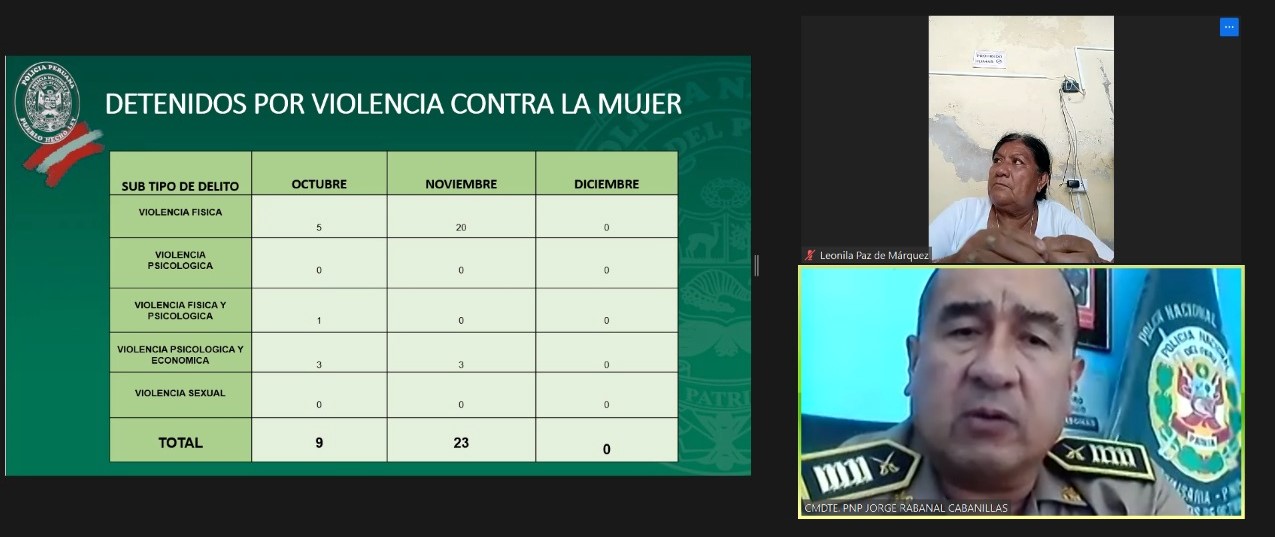 Desde la Comisaría de Veintiséis de Octubre, el comandante de la PNP, Jorge Rabanal Cabanillas, detalló que en la comisaría de su jurisdicción se registraron 9 casos de violencia contra a mujer durante octubre y 23 durante noviembre.