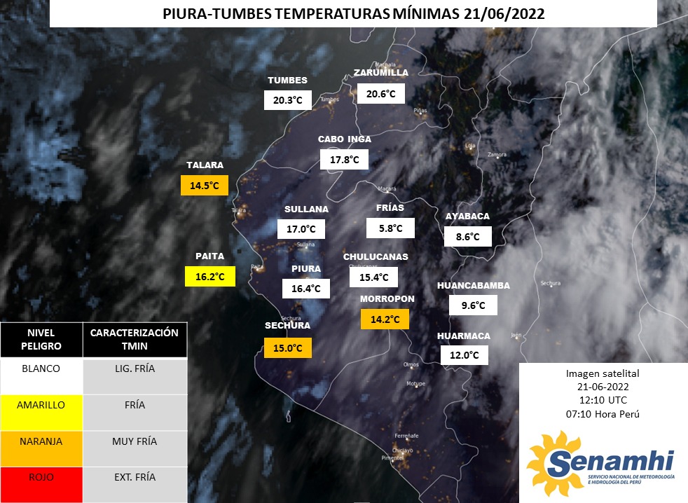 Mientras que en Piura se registra 16.4 grados de temperatura, en Chulucanas 15.4°, Sechura 15° y en Talara 14.5°.