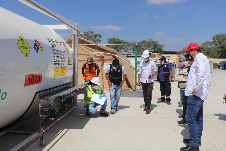 El gobernador regional Servando García inspeccionó el inicio del uso de este isotanque que tiene una capacidad aproxiamda de 18 toneladas de oxígeno líquido (más de 13 mil m3), el cual a través de un vaporizador se convierte en gas y mediante un sistema de tuberías llega hasta las camas de los pacientes.
