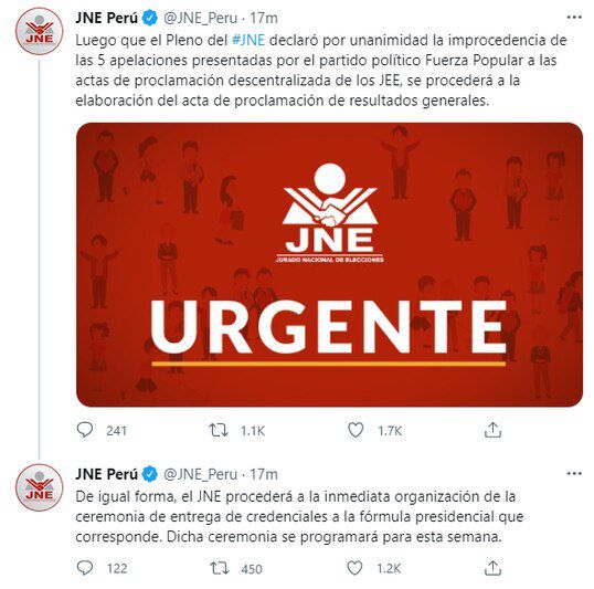 “Luego de que el Pleno del JNE declaró por unanimidad la improcedencia de las cinco apelaciones presentadas por el partido político Fuerza Popular a las actas de proclamación descentralizada de los Jurados Electorales Especiales (JEE), se procederá a la elaboración del acta de proclamación de resultados generales”, señaló el organismo electoral en su cuenta de Twitter.