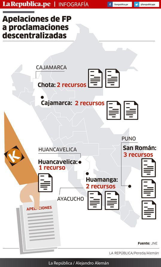 Fuerza Popular ha interpuesto 10 recursos contra las proclamaciones descentralizadas de cinco Jurados Electorales Especiales (JEE), que corresponden a los resultados electorales de las provincias de Cajamarca y Chota, en el departamento de Cajamarca; Huamanga, en Ayacucho; Huancavelica, en la región del mismo nombre; y San Román, en Puno.