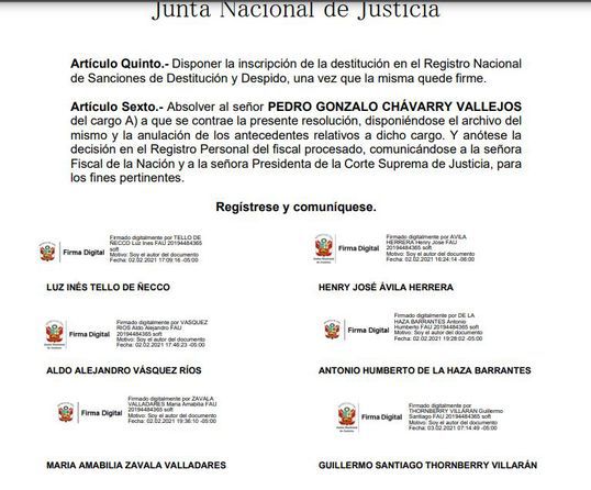 Luego de dos horas de exposición por parte del ponente Henry Ávila, el resto de los miembros de la JNJ sostuvo por unanimidad que se mantenga la medida contra Chávarry, a través de los votos de Ávila como de Guillermo Thornberry, Antonio de la Haza, Aldo Vásquez, Luz Tello y María Zavala. La integrante Imelda Tumialán no votó ya que fue quien dirigió el proceso disciplinario contra Chávarry desde febrero de 2020.