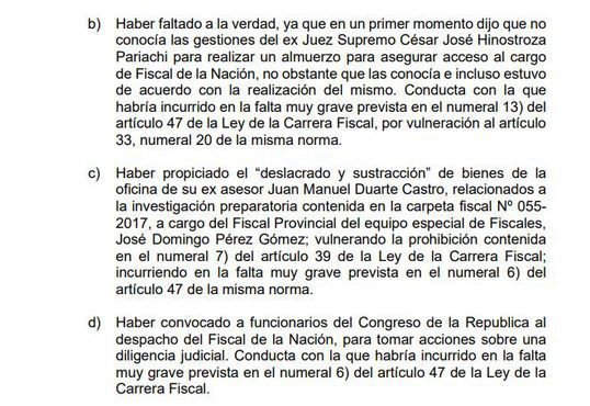 Además, el facilitar y “propiciar la extracción de bienes a la oficina de su exasesor Juan Duarte Castro” a inicios de 2019 y relacionado a la investigación del fiscal Domingo Pérez (deslacrado de oficinas); así como el “haber convocado a funcionarios del Congreso al despacho del fiscal de la Nación para tomar acciones” contra el allanamiento a dichas oficinas en la Fiscalía.