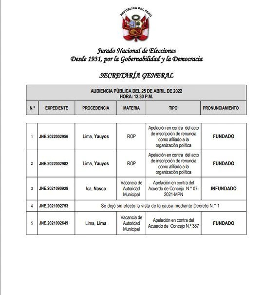 La decisión fue resuelta por el Pleno del Jurado Nacional de Elecciones, presidido por José Luis Salas Arenas el último martes 26 abril.