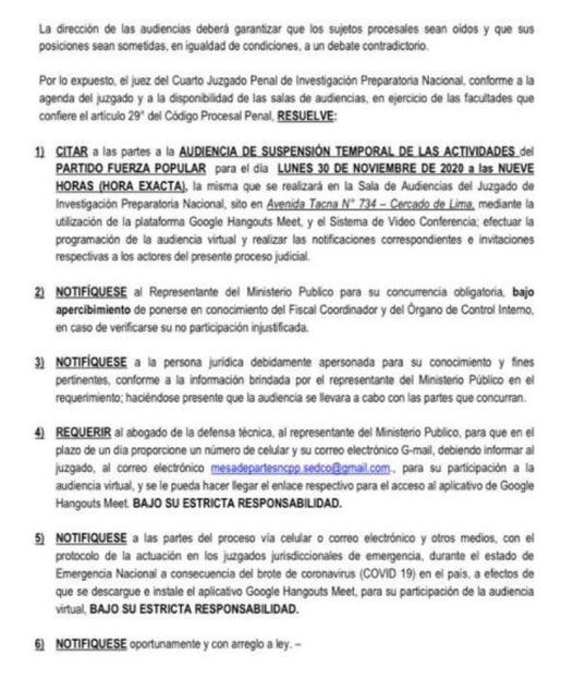 De acuerdo a los fundamentos expuestos por el fiscal, que le imputa al partido presunto lavado de activos con el agravante de una organización criminal, el partido fujimorista incurrió en varios intentos por obstaculizar las investigaciones en su contra mediante sus vínculos con Pedro Chávarry, César Hinostroza, entre otros.