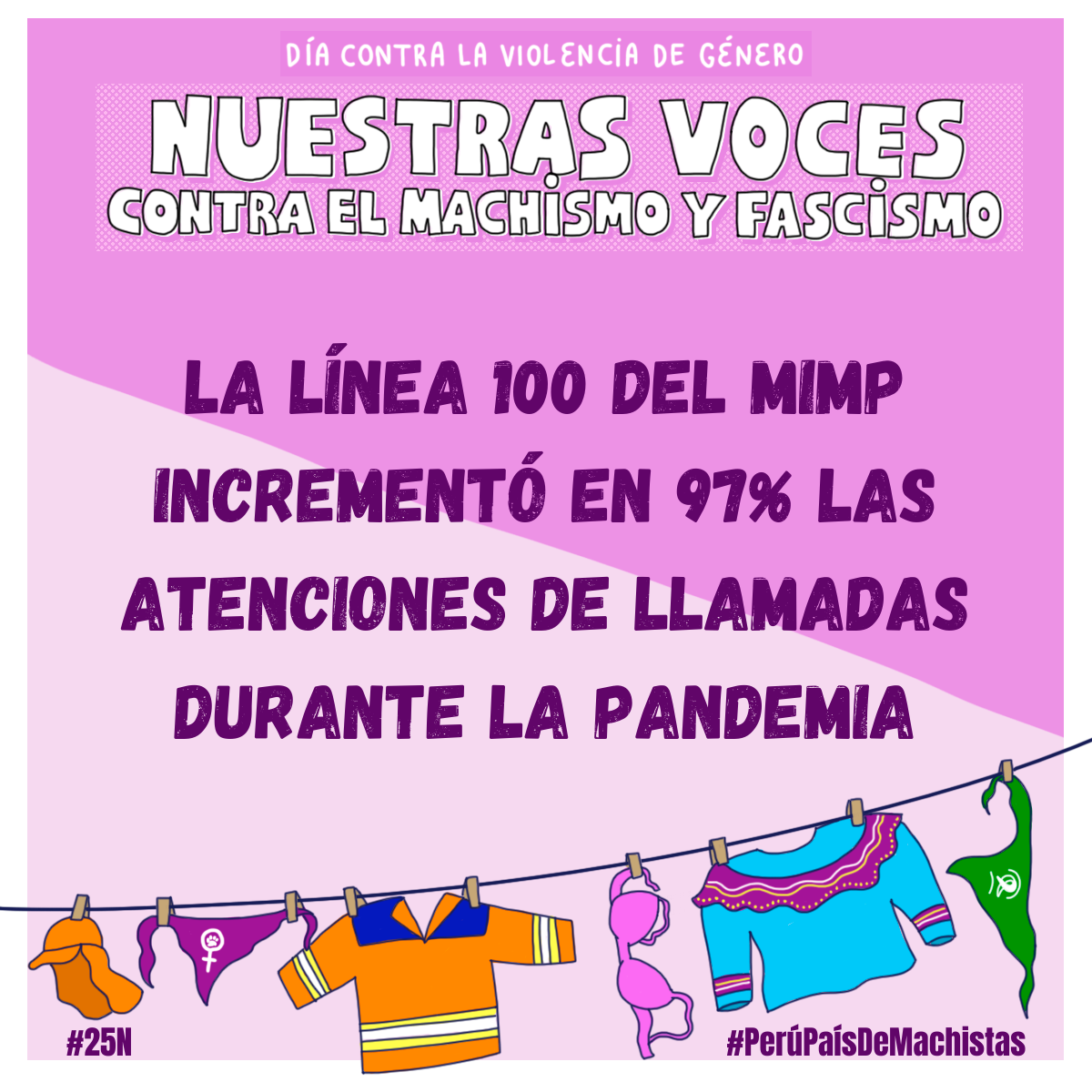 En el marco del 25 de noviembre, Día Internacional contra la Violencia hacia la Mujer, la pandemia ha demostrado que la violencia contra las mujeres no se detiene bajo ninguna circunstancia y que, por el contrario, aumenta en contextos de riesgo. En los cuatro primeros meses de cuarentena de 2020, la Línea 100 del Ministerio de la Mujer atendió 81 mil 430 casos de violencia contra las mujeres e integrantes del grupo familiar, casi cuatro veces más que los registrados en los mismos meses de 2019. Sin embargo, un gran porcentaje de agresiones no se formalizan como denuncias ante las autoridades.