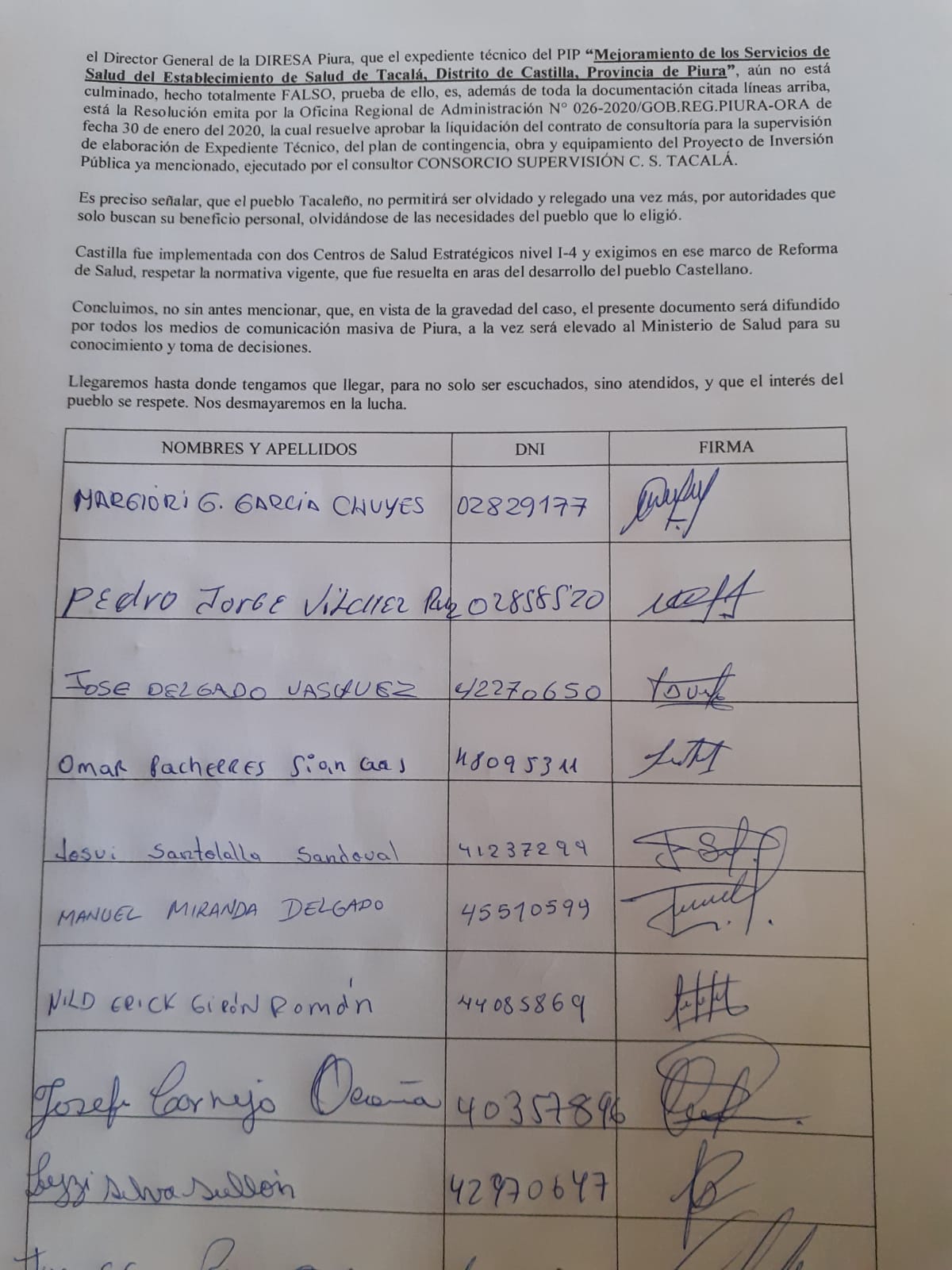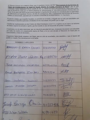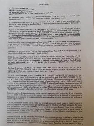 La secretaria de la junta vecinal comunal (Juveco) del asentamiento Tacala, Margiori García Chuyes, informó que esta mañana le entregaron un memorial a los representantes de la gestión de Servando García Correa. Ahí piden convocar la licitación del centro de salud que ya cuenta con expediente técnico y un presupuesto fijado.