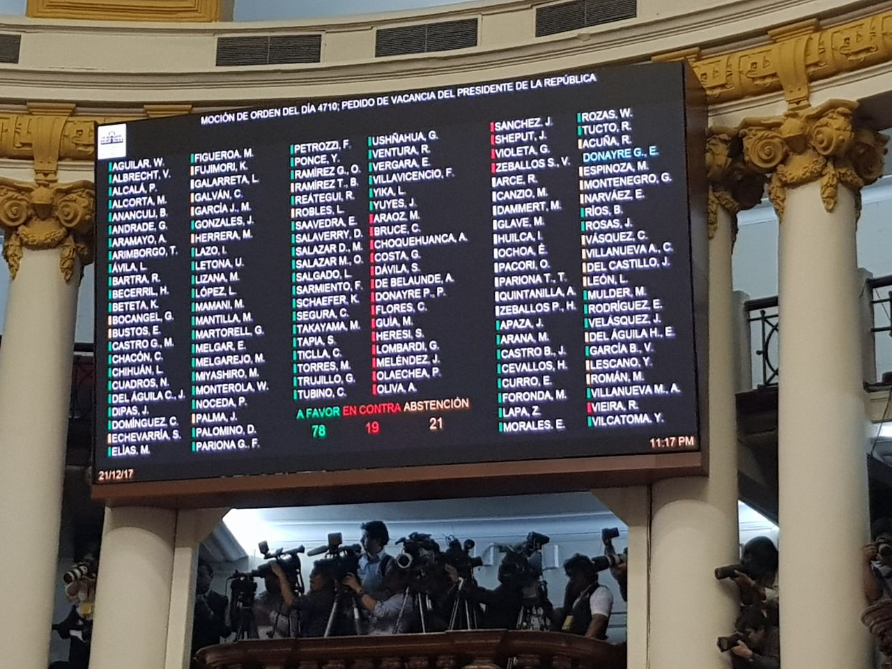 Tras un debate de casi 12 horas, el resultado de la votación en el parlamento quedó con 78 votos a favor, 19 en contra y 21 abstenciones. Para aprobar la vacancia se necesitaban 87 votos a favor. Con ello, Kuczynski se salvó de ser removido de su cargo, tras ser cuestionado por sus vínculos con la empresa constructora Odebrecht.