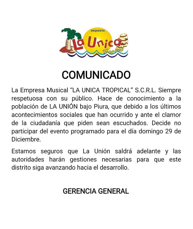 Por su parte, la orquesta musical La Única Tropical hizo público su no participación a través de un comunicado.