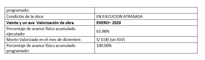 Según consta en el informe emitido por el jefe de supervisión, Ing. David Aquino Condezo, hasta enero del 2020, el avance de la obra era de casi el 64%, cuando para entonces, debió haber culminado.