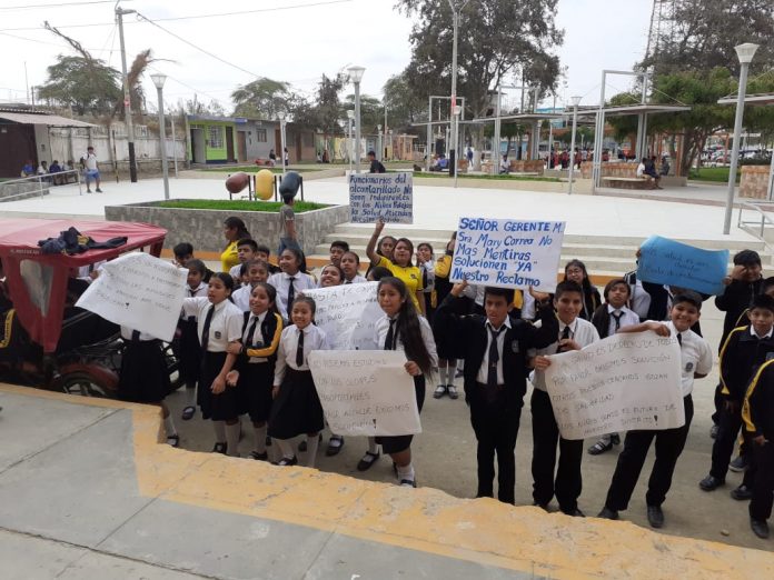 Los escolares de la IE Ricardo Palma en La Unión, protestaron frente a la municipalidad por el colapso de los desagües que genera malos olores y perjudica su salud.
