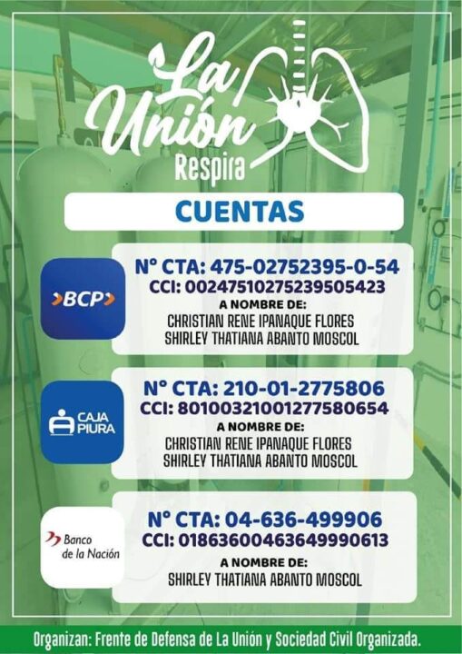 El distrito de La Unión se sumó a las localidades que han emprendido campañas para adquirir plantas de oxígeno en beneficio de los enfermos de covid. El integrante del colectivo “La Unión respira con el corazón”, Danilo Valdiviezo Valdiviezo, invita a los pobladores, instituciones y empresas piuranas a unirse a la iniciativa para recaudar fondos en este distrito.