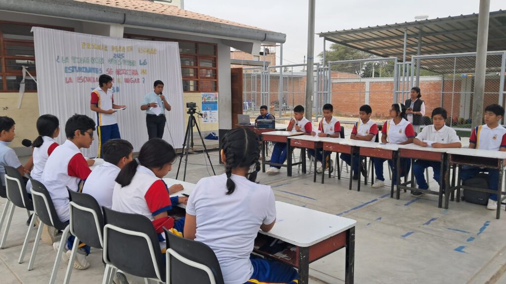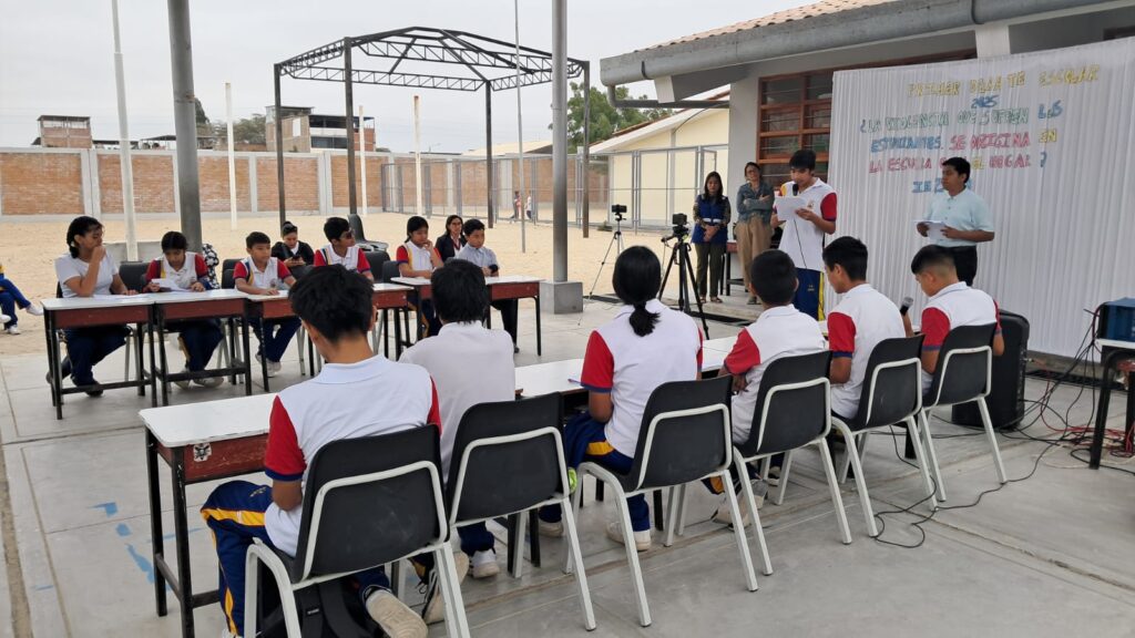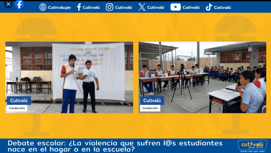 El evento, realizado en el patio de inicial de la institución, fue transmitido en vivo por la multiplataforma de Cutivalú y forma parte del proyecto “Construyendo juntos proyectos de vida”, impulsado por Cementos Pacasmayo y Cutivalú, que busca desarrollar habilidades comunicativas en adolescentes para fortalecer el liderazgo y el relacionamiento comunitario.
