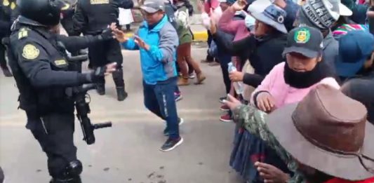 Aproximadamente 60 policías a pie y con una tanqueta detrás, transitaban por una calle de Laraqueri, capital de la provincia de Pichacani, y se encontraron con aproximadamente 300 mujeres y hombres que no los dejaron pasar. Un grupo de policías pretendió forzar y abrirse camino, pero al ver que los manifestantes le cerraban el paso, … Sigue leyendo Laraqueri Puno: población impidió el paso de policías