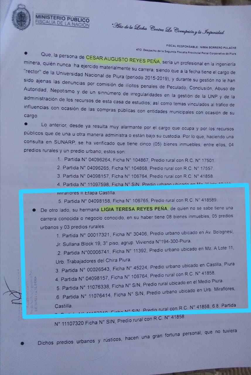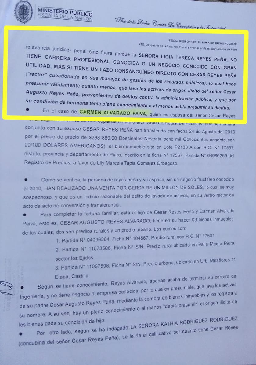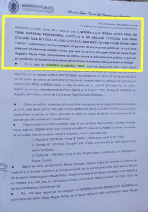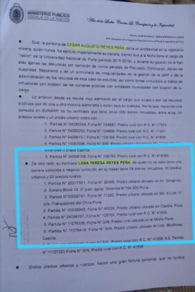 Según la denuncia, la investigada Lidia Reyes Peña no contaría con trabajo ni negocio conocido “pero tiene cinco predios urbanos y tres predios rurales, lo cual hace presumir que lava los activos de origen ilícito del señor César Reyes, provenientes de delitos contra la administración pública” se lee en la denuncia sobre la que investiga la Fiscalía.